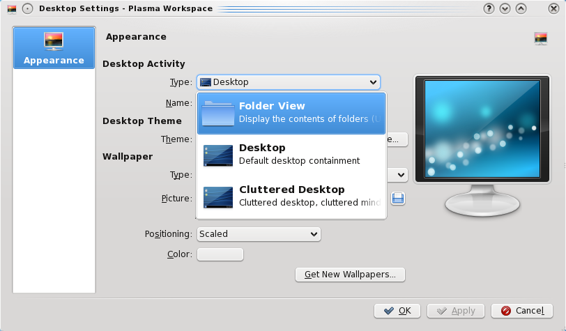 - Right click on the desktop -> Appearance Settings (in my version it’s called Desktop Settings, but I think KDE 4.2 uses the former name).