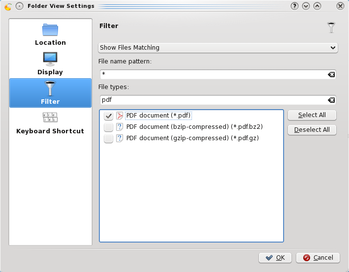 The “Filter” page lets you set which types of items the Folder View should display. The default setting is “Show all files”, but you can choose to show or hide certain files based on their file name and type. For example. I might want to show all image files that begin with “kde” in a directory.