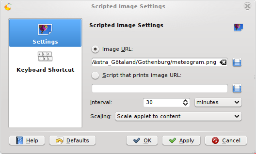 -> Add Widgets… -> drag “Scripted Image” to your desktop) and click on “Configure…” in the widget. - In the dialog, paste the URL from step 2 under “Image URL”. Choose an appropriate number of minutes (for example 30) for reload “Interval” and set “Scaling” to “Scale applet to content”. Click on “OK”.