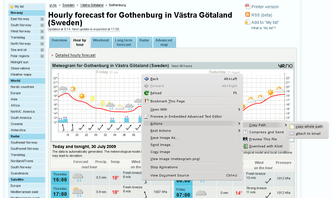 Note: When I close the dialog I get a message stating that the installation failed. However, seeing how the widget appears fine, it seems like it’s just false alarm. - Go to yr.no and search for your city. Click on “Hour by hour” and get the URL for the image (in Konqueror: right click -> Actions -> Copy Path -> copy whole path).