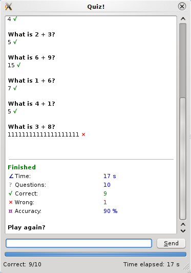 Quiz! can be used for other questions as well – you just have to derive from AbstractQuestionGenerator and implement the generate() function. I’ve only made two question generators so far, the one shown above and one for a math quiz: