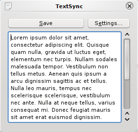 TextSync is an extremely simple text editor. Rather than loading and saving text files, it “syncs” to a user-defined text file (from now on referred to as the original file; synced text is the text shown in the application):