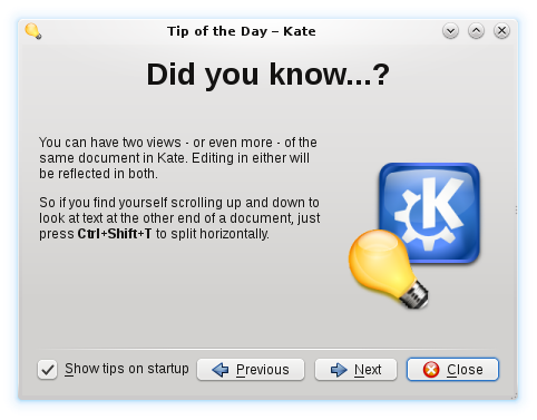 Personally I never read these dialogs for a simple reason – if I launch Kate, I want to start using Kate right away. Get out of my way.
