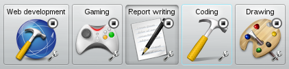 For tasks that require more than one application, instead of starting each application individually we rather want to start a new “session”. One click and everything is set up – the applications are started with the right files open, windows are ordered in the way we prefer and everything belonging to other tasks get out of the way. Switching task should be a simple matter of switching “session”.