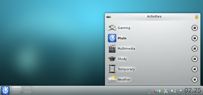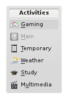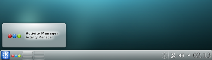 → Activities…, it sums up to four click just to switch activity! That’s at least two clicks too much, in my opinion. - Give activities a more central place in the workspace (like in Plasma Active). Perhaps adding an icon/widget to the default panel to show the activity manager.