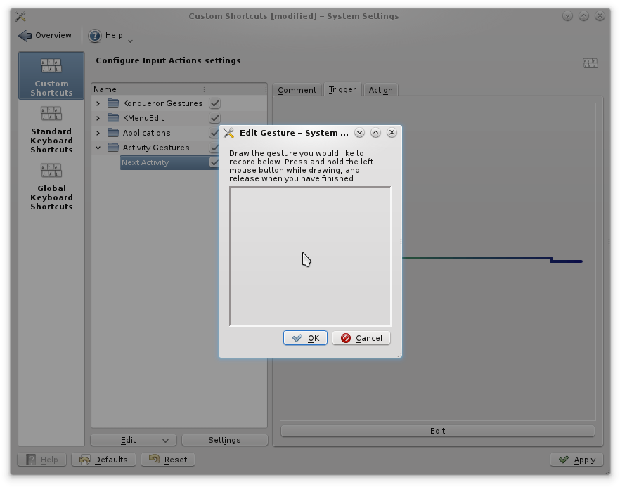 Before we can add new mouse gestures we need a command to switch activities and to show the activity manager. I couldn’t find any specific D-Bus calls to achieve this, but all shortcuts in KDE Software can be called using D-Bus. (There’s a “Send Keyboard Input” option in the System Settings module , but I can’t get it to invoke keyboard shortcuts.)