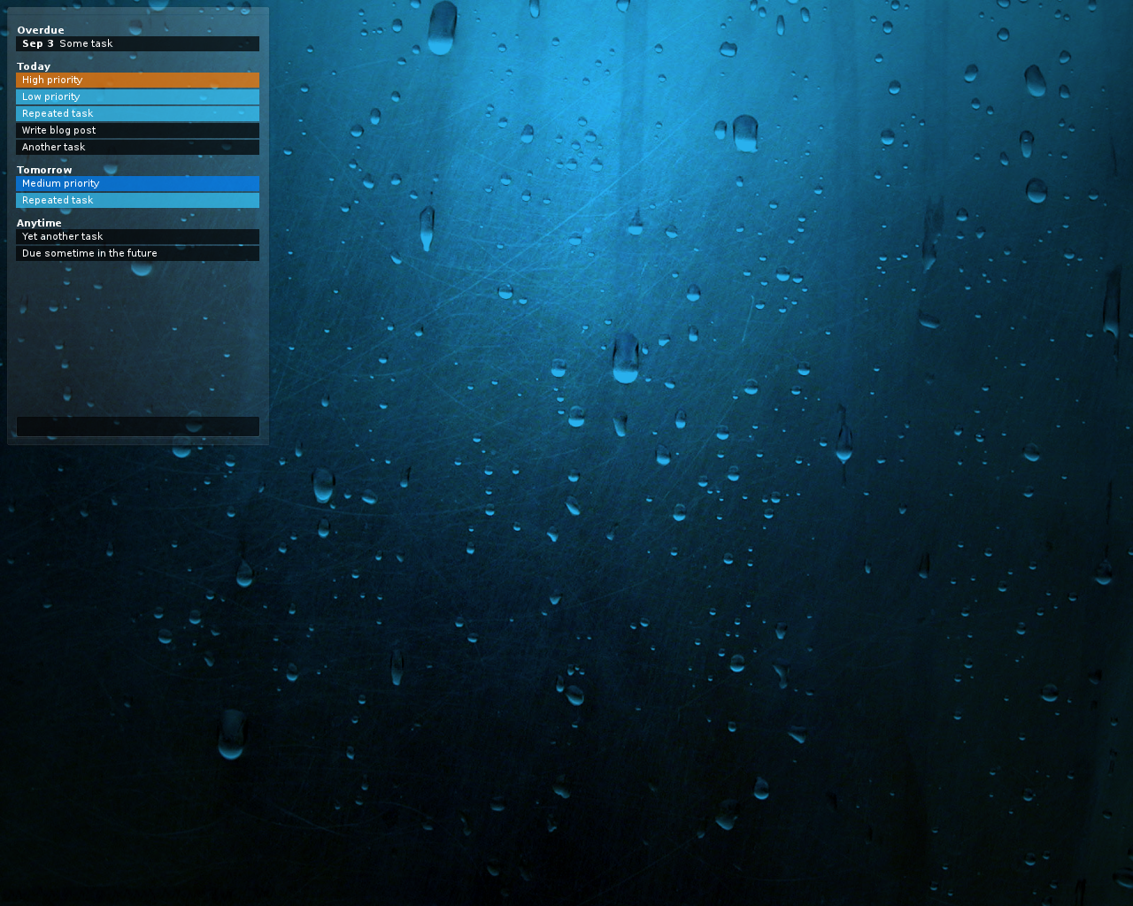 One of the top candidates was Remember The Milk, a plasmoid written by Andrew Stromme, which is included in kdeplasma-addons and thus often installed by default. I created an account on the Remember The Milk site and played around with the widget for a bit. It supported all the features I asked for and much more – great! The way of adding new tasks was also very nice. For example, I can write “Clean room tomorrow”, and it understands that I want the task “Clean room” scheduled for tomorrow (actually, it’s much smarter than that). However, I’m a person who likes minimalism, the KISS principle and clean desktops, and unfortunately Remember The Milk made my desktop feel too cluttered for my tastes (a problem shared by many widgets, by the way).